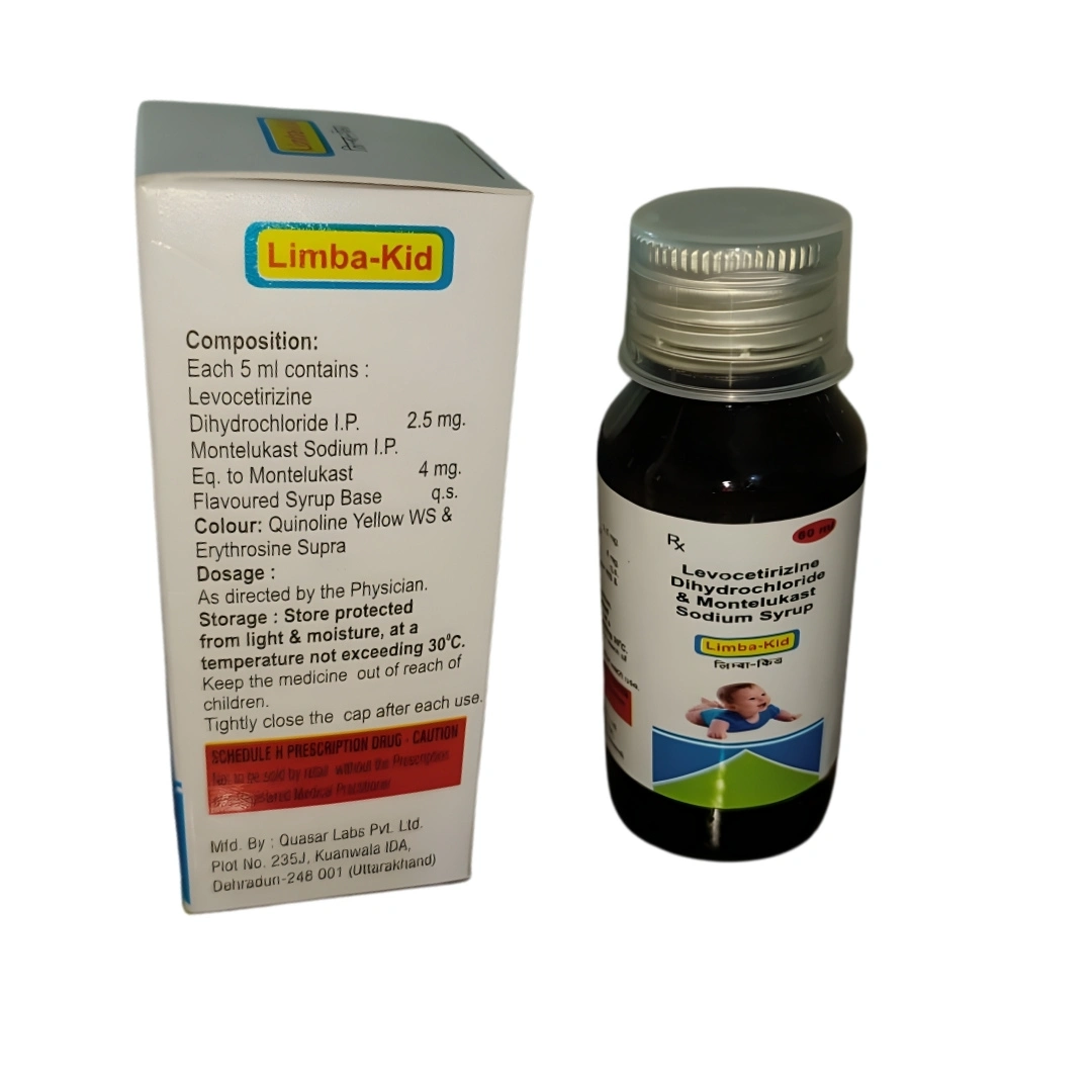 Limba-Kid Syrup by Wellfine Life Science Pvt. Ltd. is a highly effective anti-allergic and anti-asthmatic formulation designed especially for children. It combines the dual action of Levocetirizine Dihydrochloride and Montelukast Sodium to relieve symptoms of allergies, sneezing, runny nose, and breathing difficulties caused by asthma or seasonal changes.